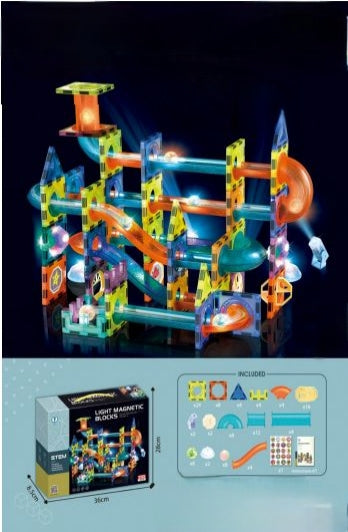 GlowTrack Magnetni Set je vsestranski 110-delni STEM komplet , ki povezuje igro, učenje in kreativnost. Z magnetnimi gradniki, prozornimi toboganskimi elementi in svetlobnimi žogicami otroci ustvarjajo osupljive steze in labirinte, ki oživijo v temi.